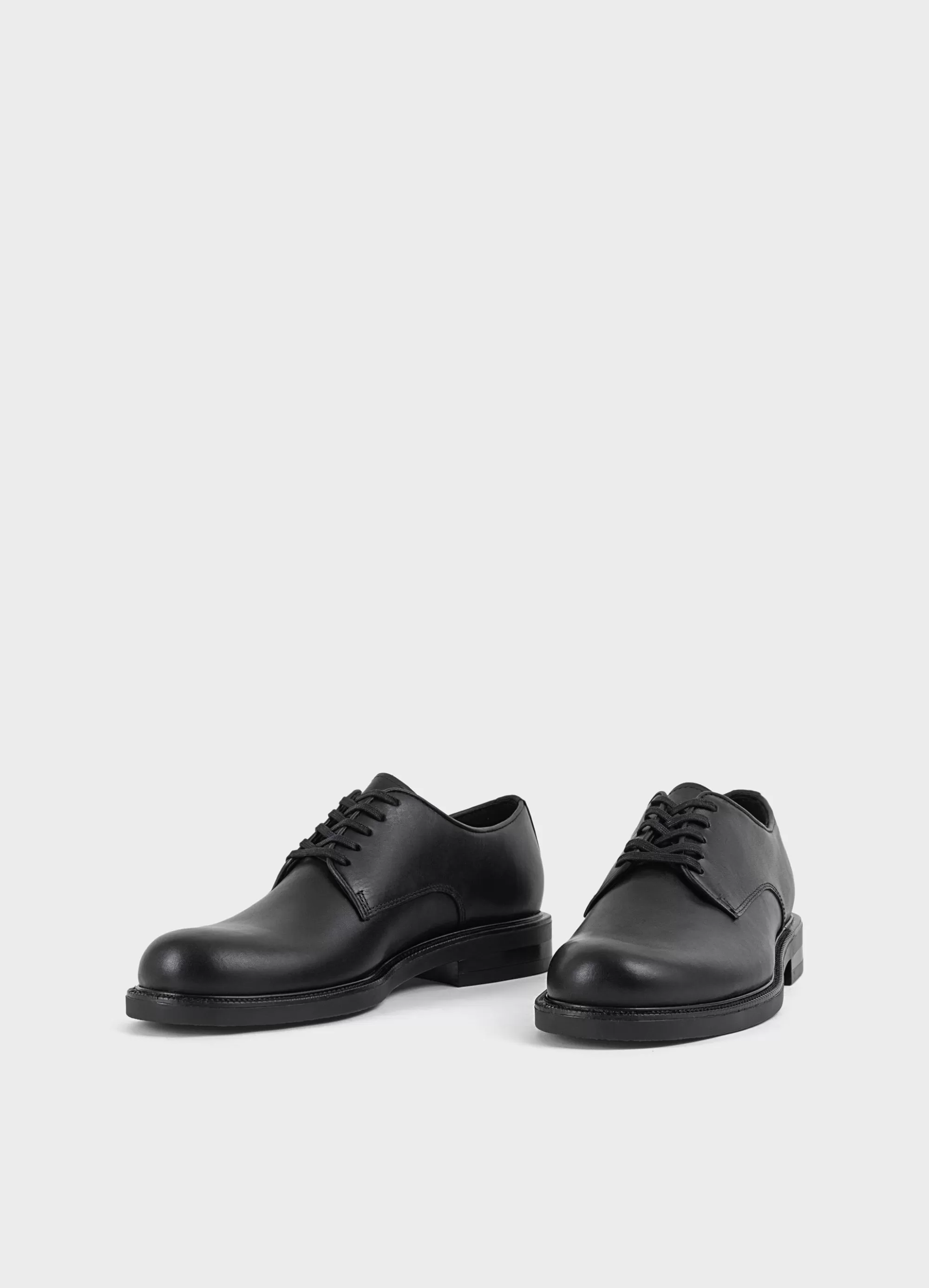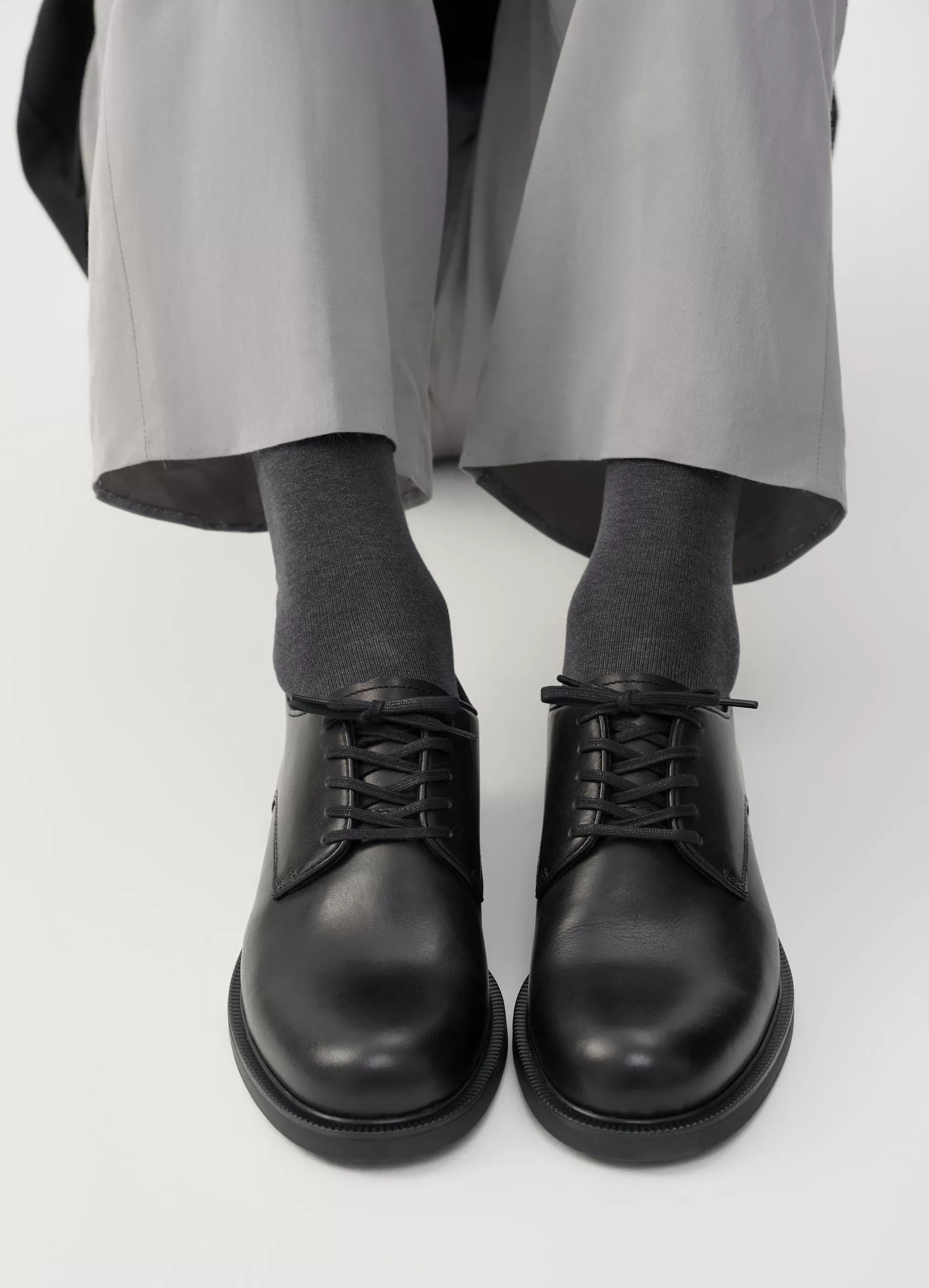Floyd is the updated Derby shoes with a minimalistic look. The style is crafted from black leather and features a rounded-toe shape, derby lacing and leather insoles. The sleek heels measure 31mm. Details include leather lining and waxed shoe laces. Black leather Rounded toe shape Derby lacing Leather lining Leather insoles 31mm heels For long-lasting care: use a black shoe cream and protector spray to ensure a longer lifespan for your shoes.